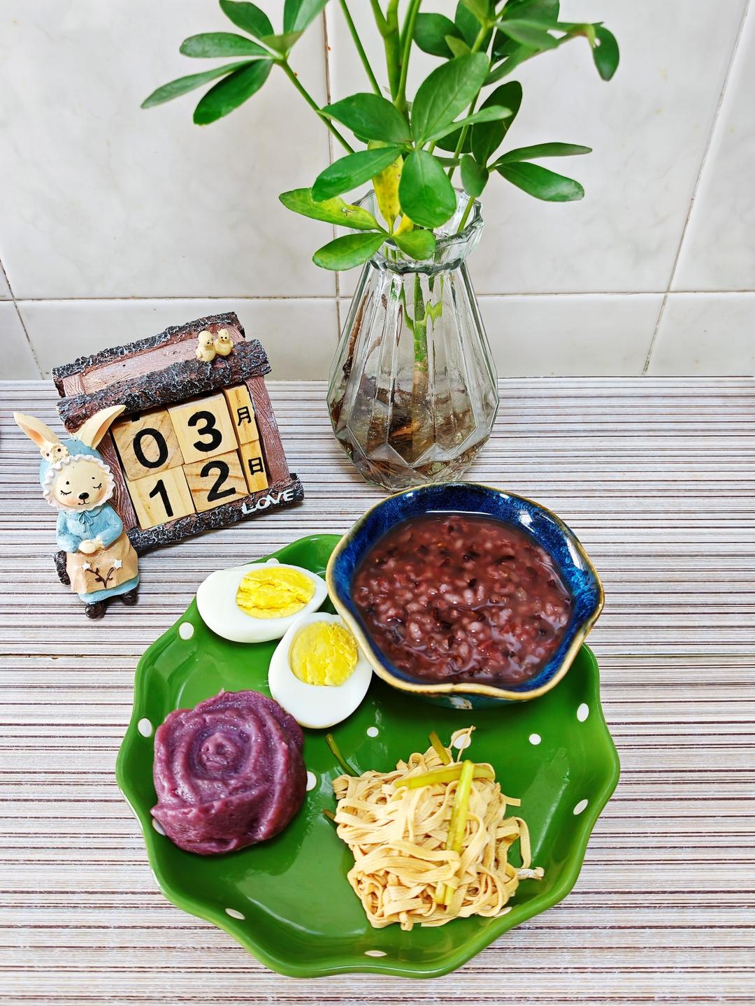 3.12早餐日记:紫米粥+水煮蛋+紫薯发糕+拌豆腐丝