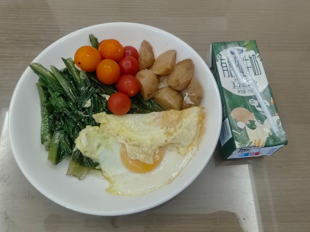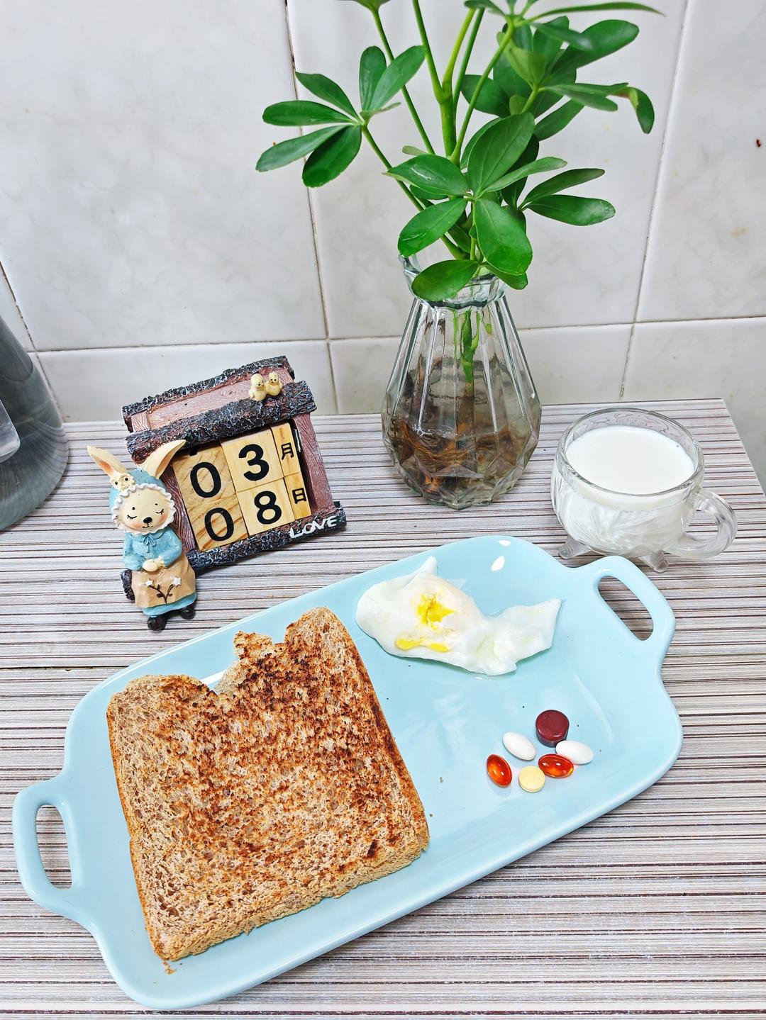 3.8早餐日记:全麦吐司+水波蛋+牛奶+维生素