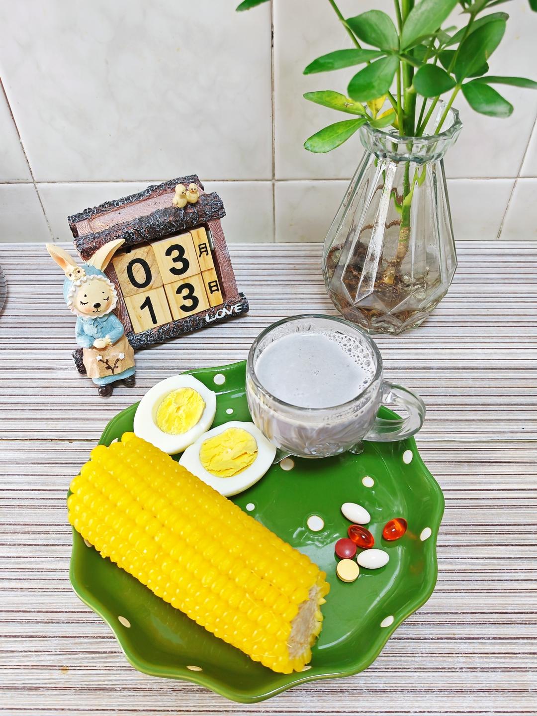 3.13早餐日记:蒸玉米+水煮蛋+豆浆+维生素