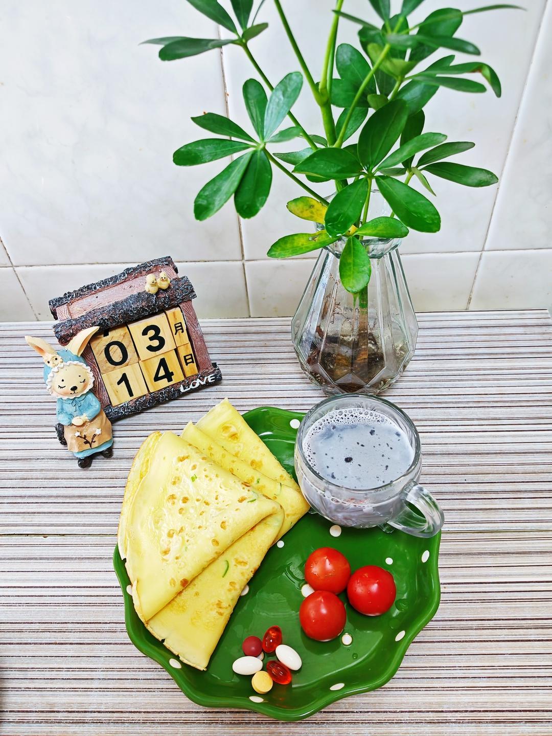 3.14早餐日记:葱花鸡蛋饼+黑豆豆浆+圣女果