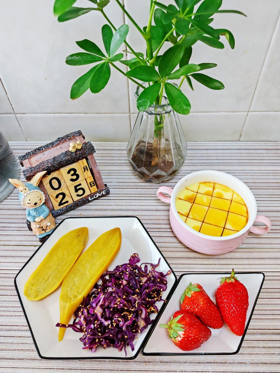 3.25早餐日记:蒸红薯+拌紫甘蓝+鸡蛋羹+草莓