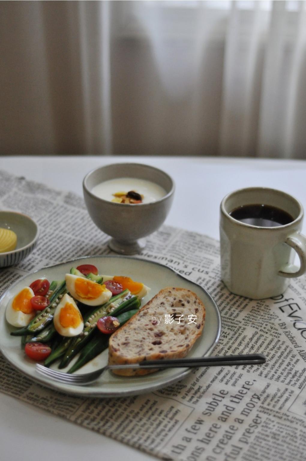 今日:奇亚籽欧包+秋葵+鸡蛋+绿豆糕+酸奶+咖啡