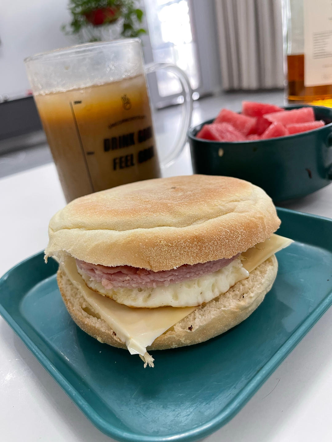 英式面包,火腿,鸡蛋,芝士片,冰咖啡,西瓜