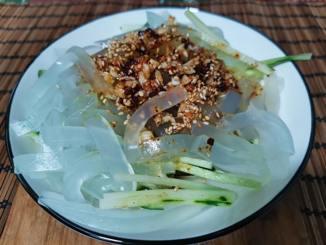 买了盒凉粉再切点黄瓜丝浇点辣油拌拌