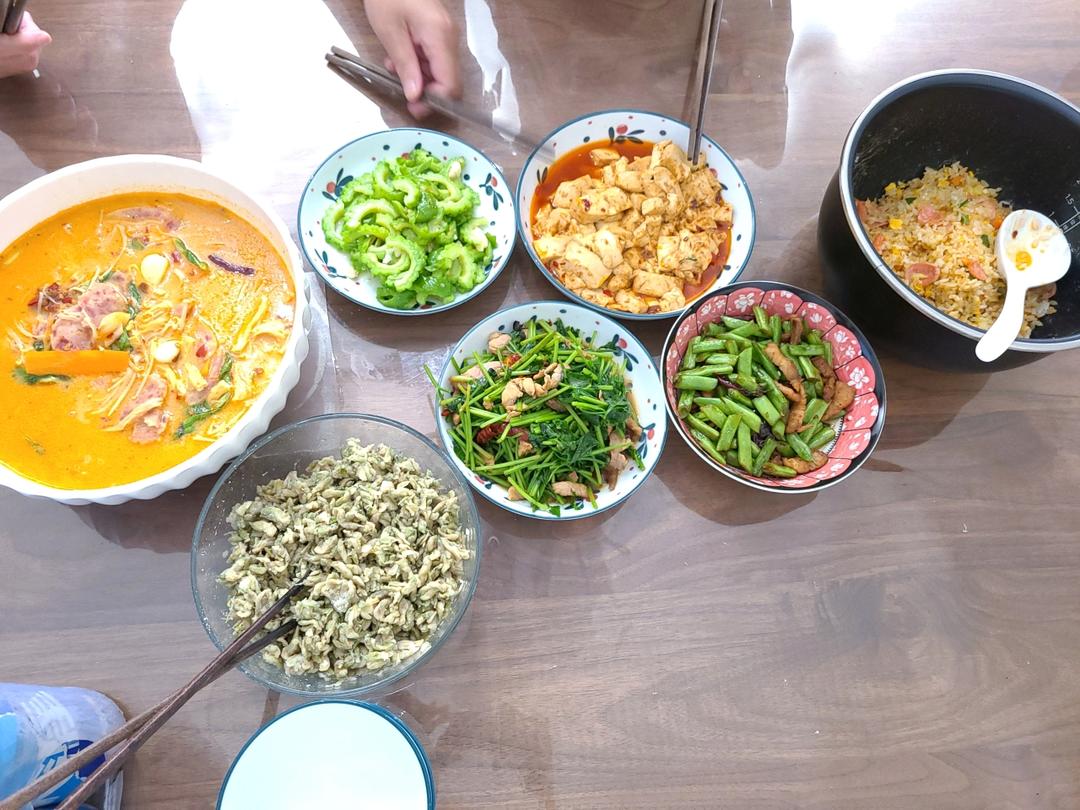 麻辣烫+炒米粉+炒苦瓜+芹菜炒肉+麻婆豆腐+蒸洋槐花