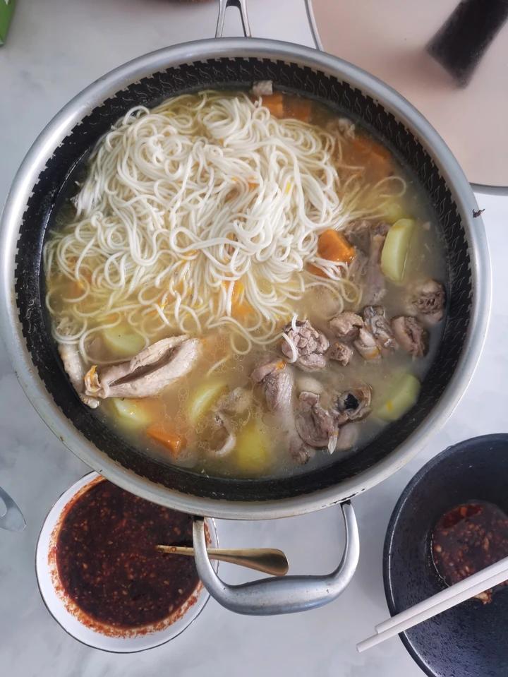 去掉了韭菜,非常好吃,两个人都饱了,剩下的汤用来煮金针菇和娃娃菜