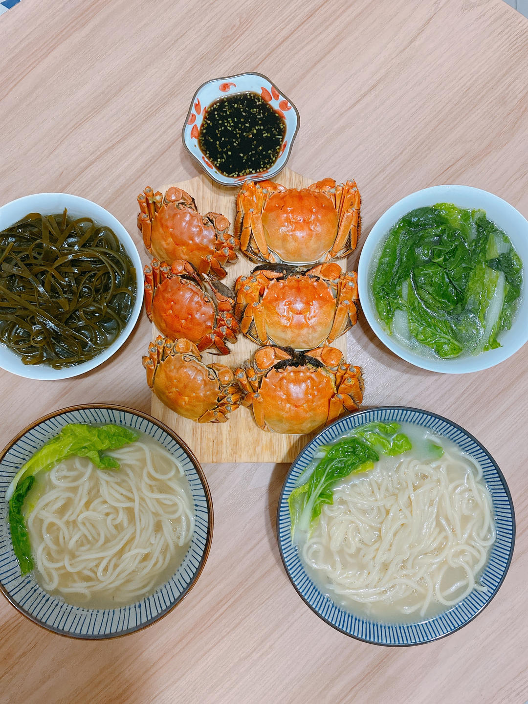 今日晚餐:清蒸大闸蟹、海带小白菜乌鸡汤面