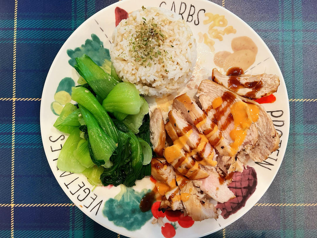 鸡胸扎孔提前一晚用味极鲜和黑胡椒腌制入味,空炸锅底部托盘放一点水,华氏360度(182摄氏度)20分钟,静置五分钟后切开
