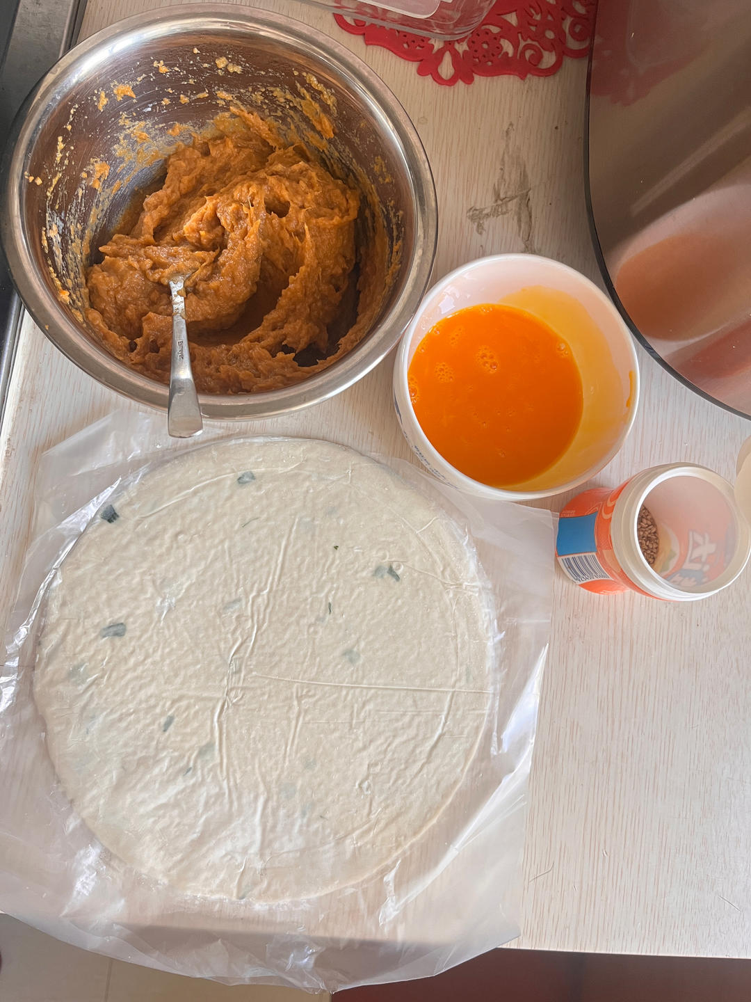 1⃣️糯米淀粉糖 牛奶混合,小火把水分煎干,在两面煎黄夹起来(昨天晚上做的,第二天早上还可以吃)