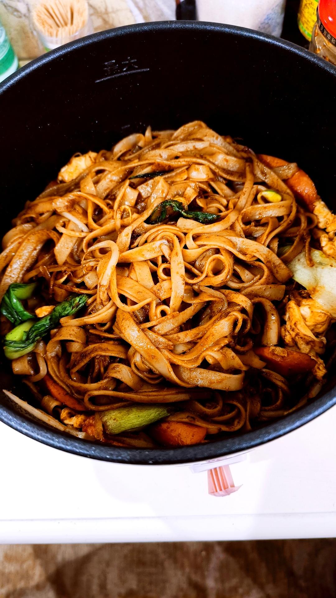 昨晚做的素炒河粉(配菜火腿 青菜 绿豆芽和鸡蛋),已经赶上路边摊的味道了