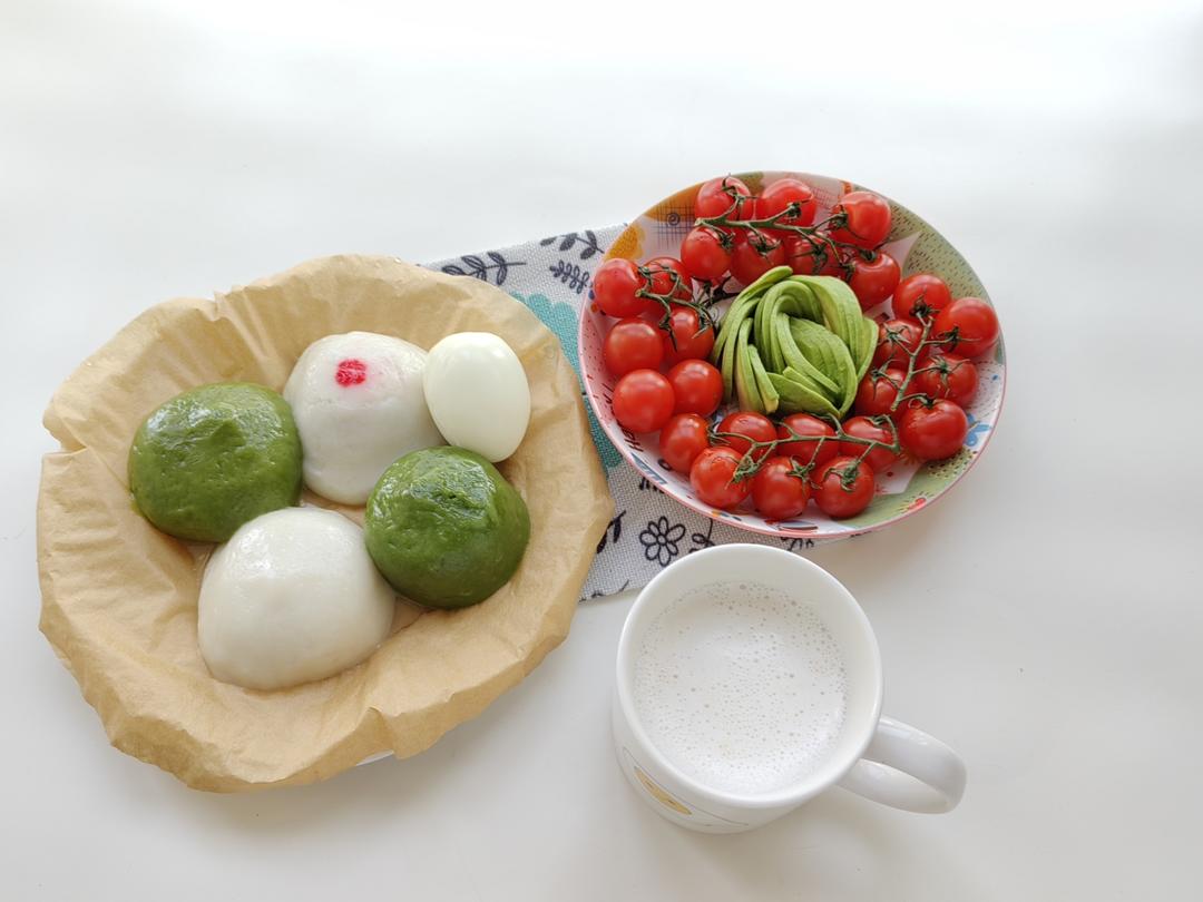 今日早餐~四个馅的团子(白色萝卜丝肉馅,白色加红点笋...