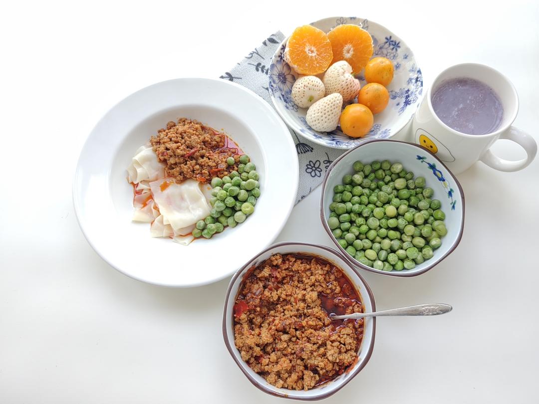 四月打卡第五天~豌豆肉酱铺盖面,三色水果,紫薯豆浆。铺盖面的配料~水煮豌豆,肉酱。