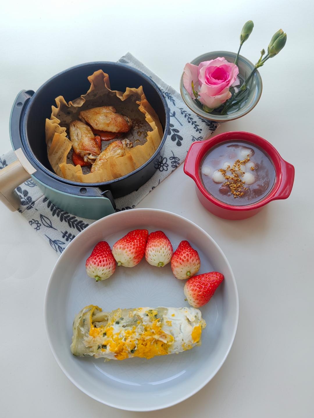 今日早餐~蛋卷饼,草莓🍓,桂花牛奶红豆沙小圆子,胡...
