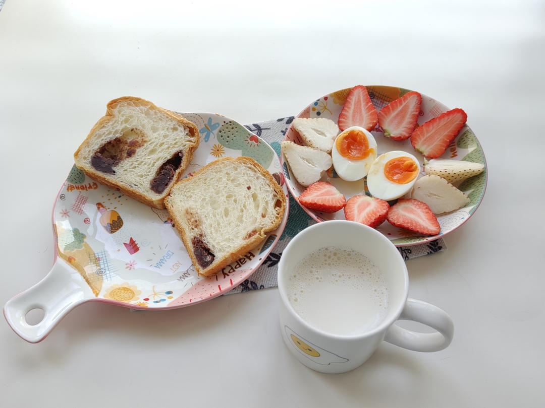 四月打卡第二天~豆沙馅切片面包(买的),草莓🍓白煮蛋,牛奶。今天起晚了,简单吃点上班去。...