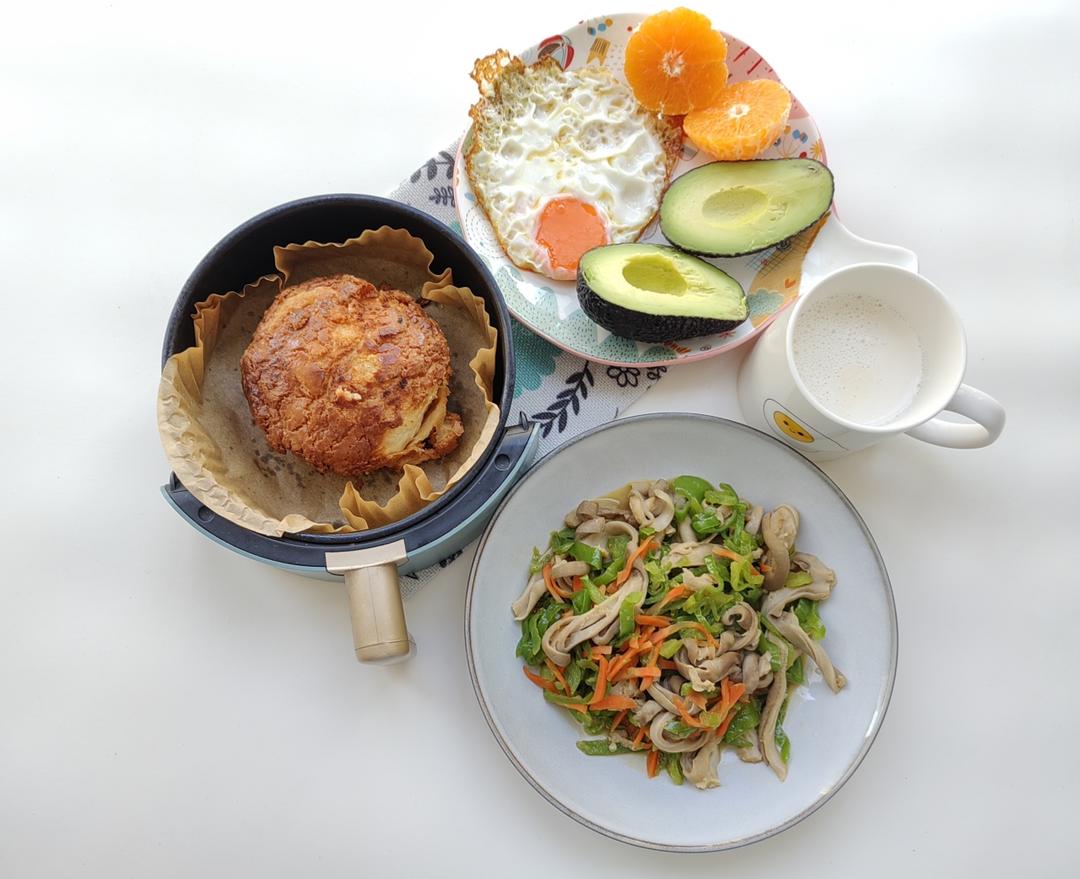 今日早餐~继续烤菠萝包,煎蛋,牛油果🥑沃柑,青椒胡萝卜...
