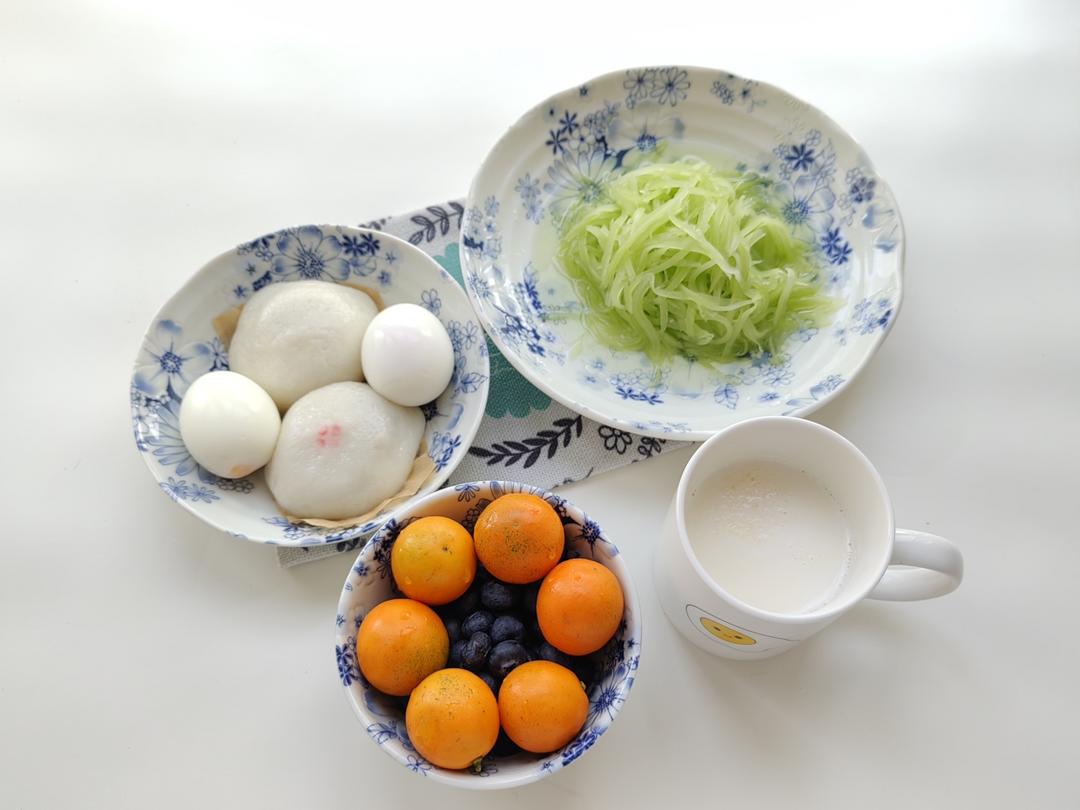 四月打卡第一天~团子(萝卜丝肉馅和笋干肉馅),白煮蛋,牛奶,蓝莓🫐金桔,凉拌莴苣。
