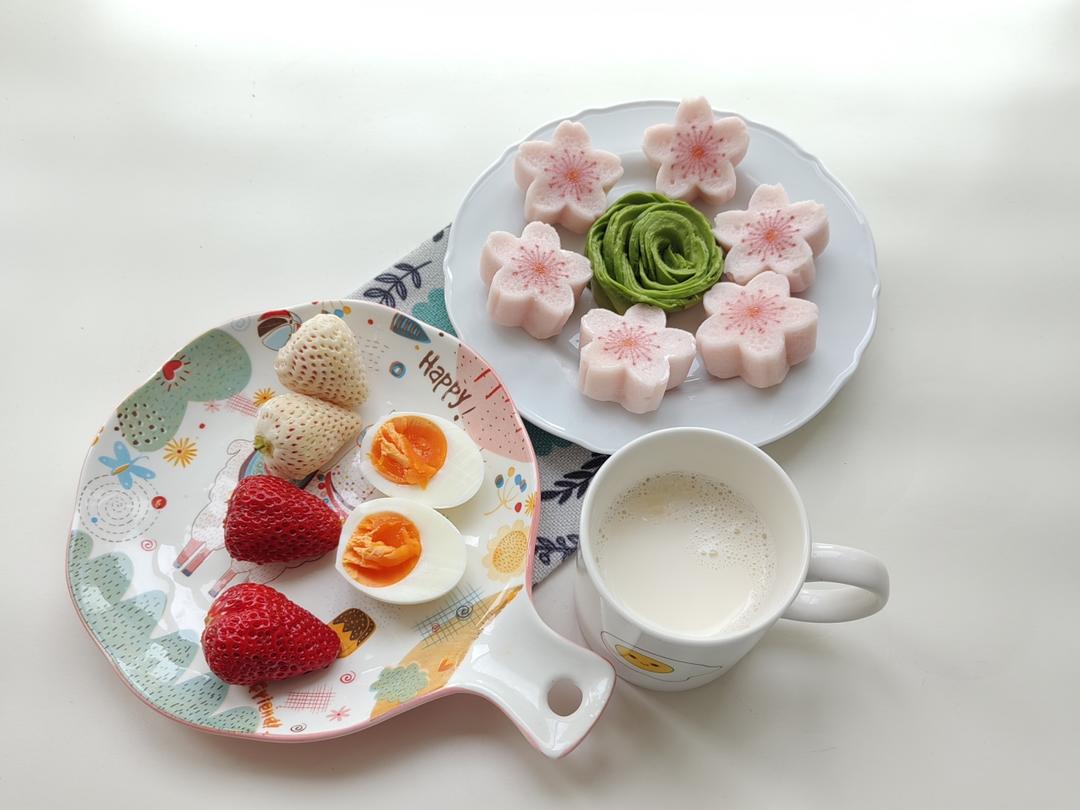 四月打卡第三天~樱花🌸米糕(买的),牛油果🥑花花,白煮蛋双色草莓🍓,牛奶。又是简单的一餐...