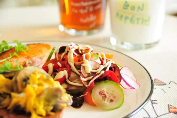 全麦面包片、煎三文鱼、口蘑炒蛋、彩椒黄花沙拉,牛奶、陈皮水。