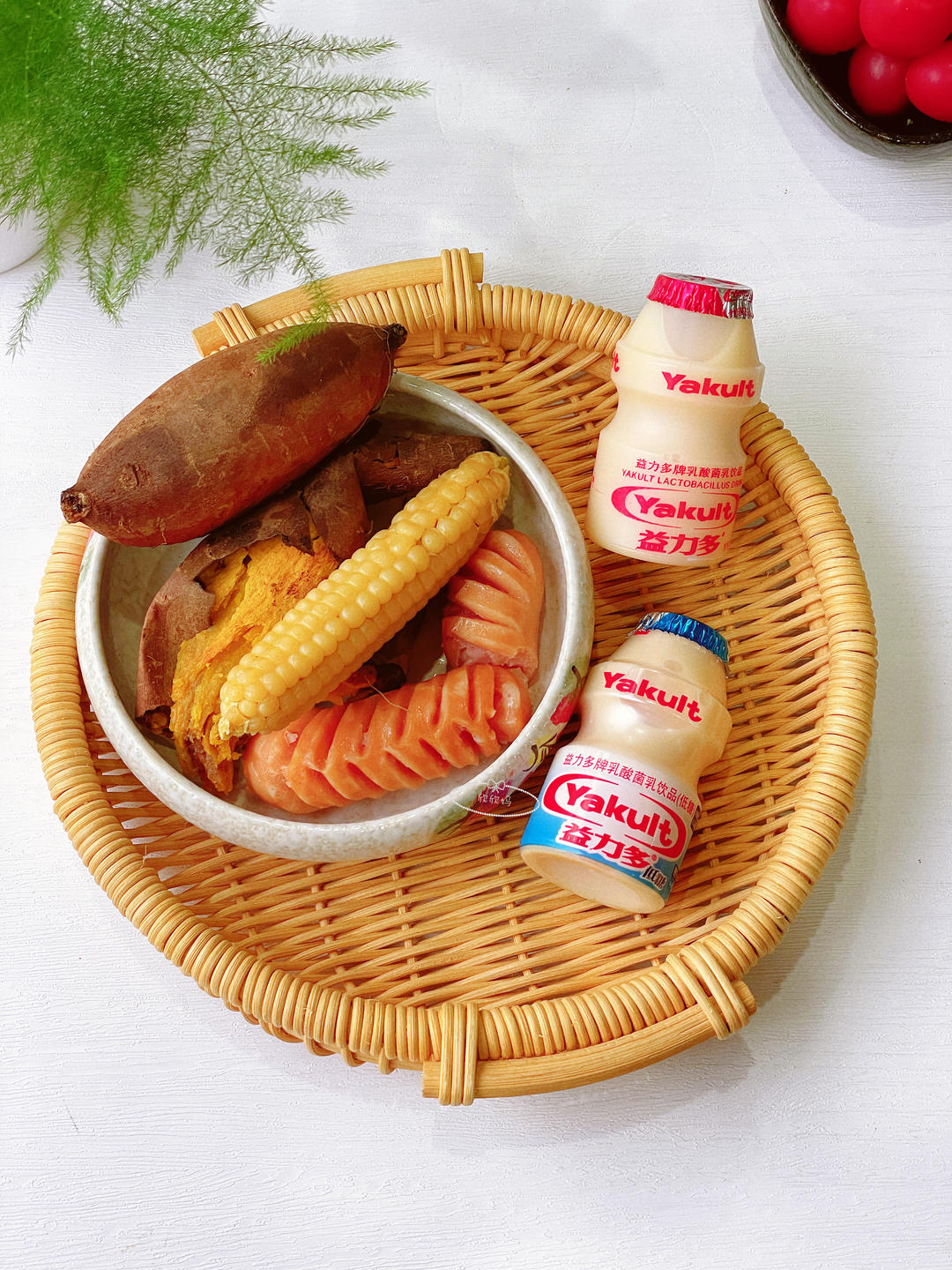 早餐烤红薯、手指玉米、烤肠加上养乐多。