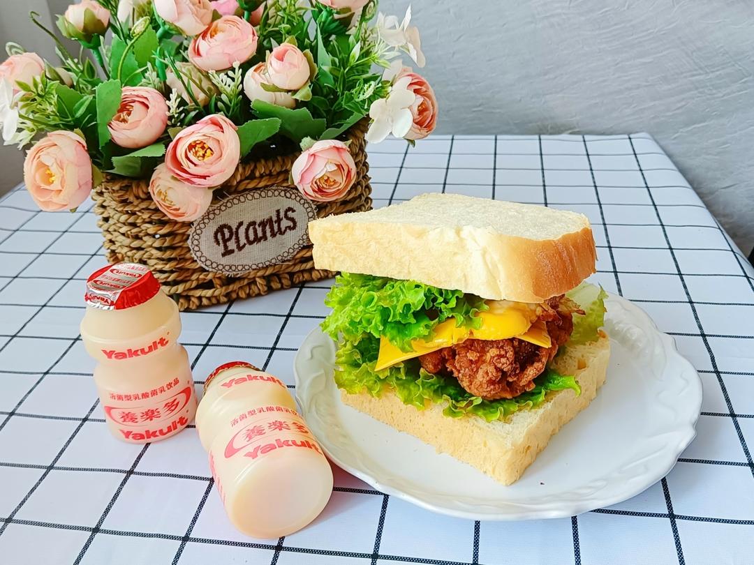 辰辰和爸爸早餐鸡腿三明治,养乐多