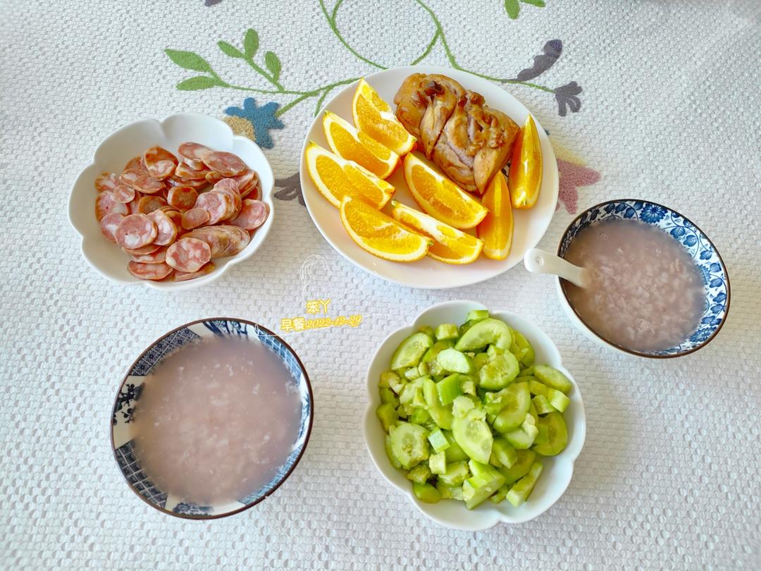 病号饭:红米糯米粥,清拌黄瓜,香肠,橙子。