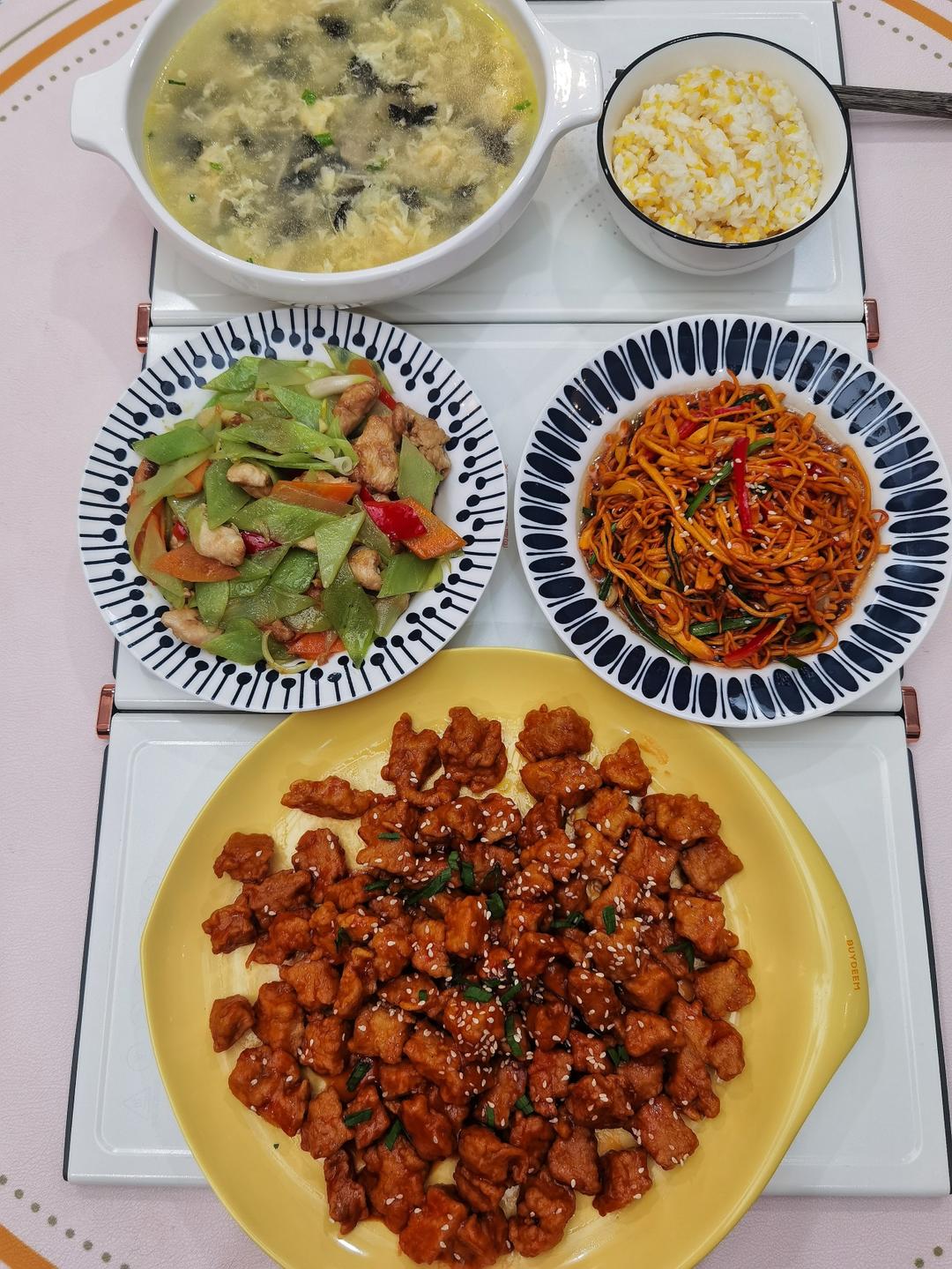 甜辣酥肉块,凉拌虫草菇,莴笋炒鸡肉,鸡丝蛋花汤,玉米米饭