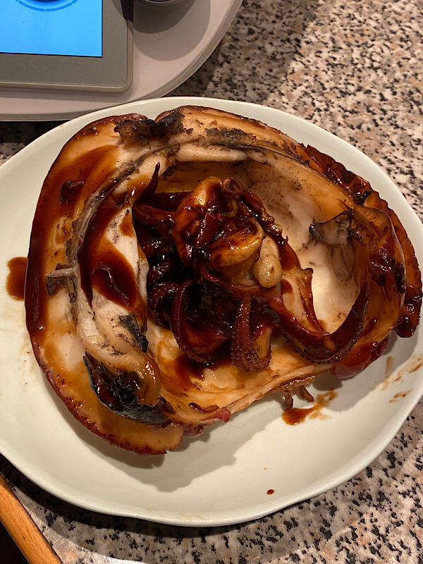 超大墨鱼烧好切片,摆盘的整整齐齐,锅里剩余的浓稠酱汁用硅胶刷子刷上去,完美😄