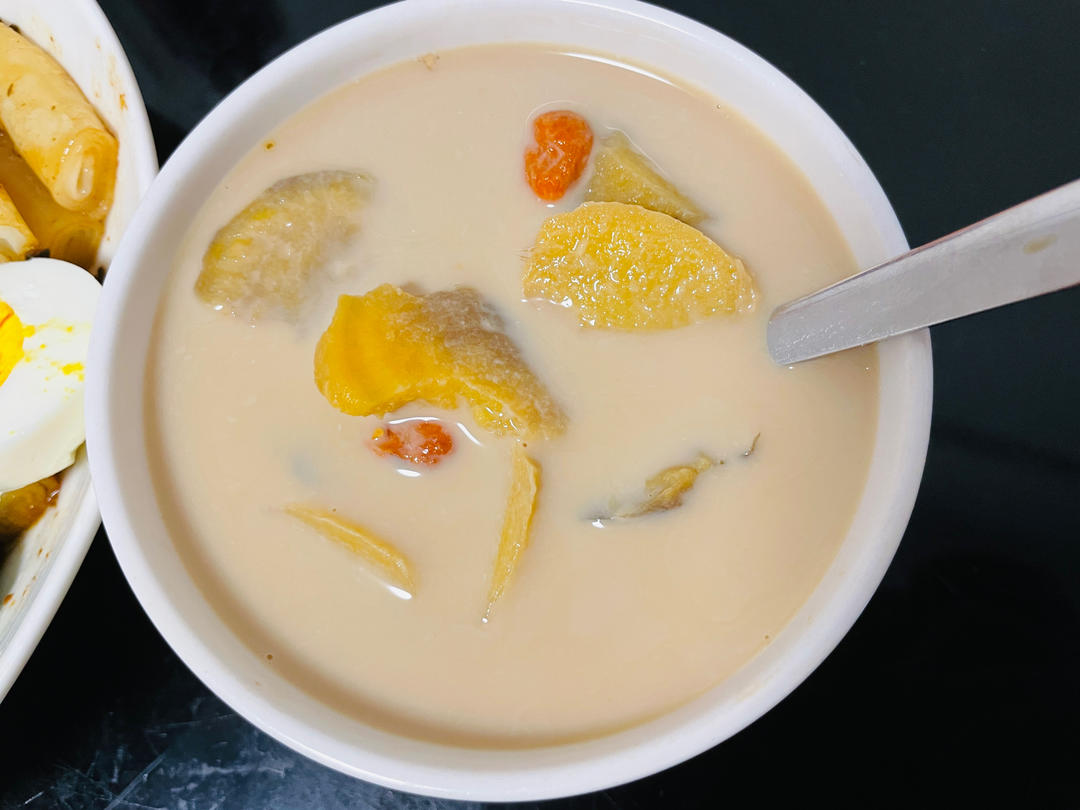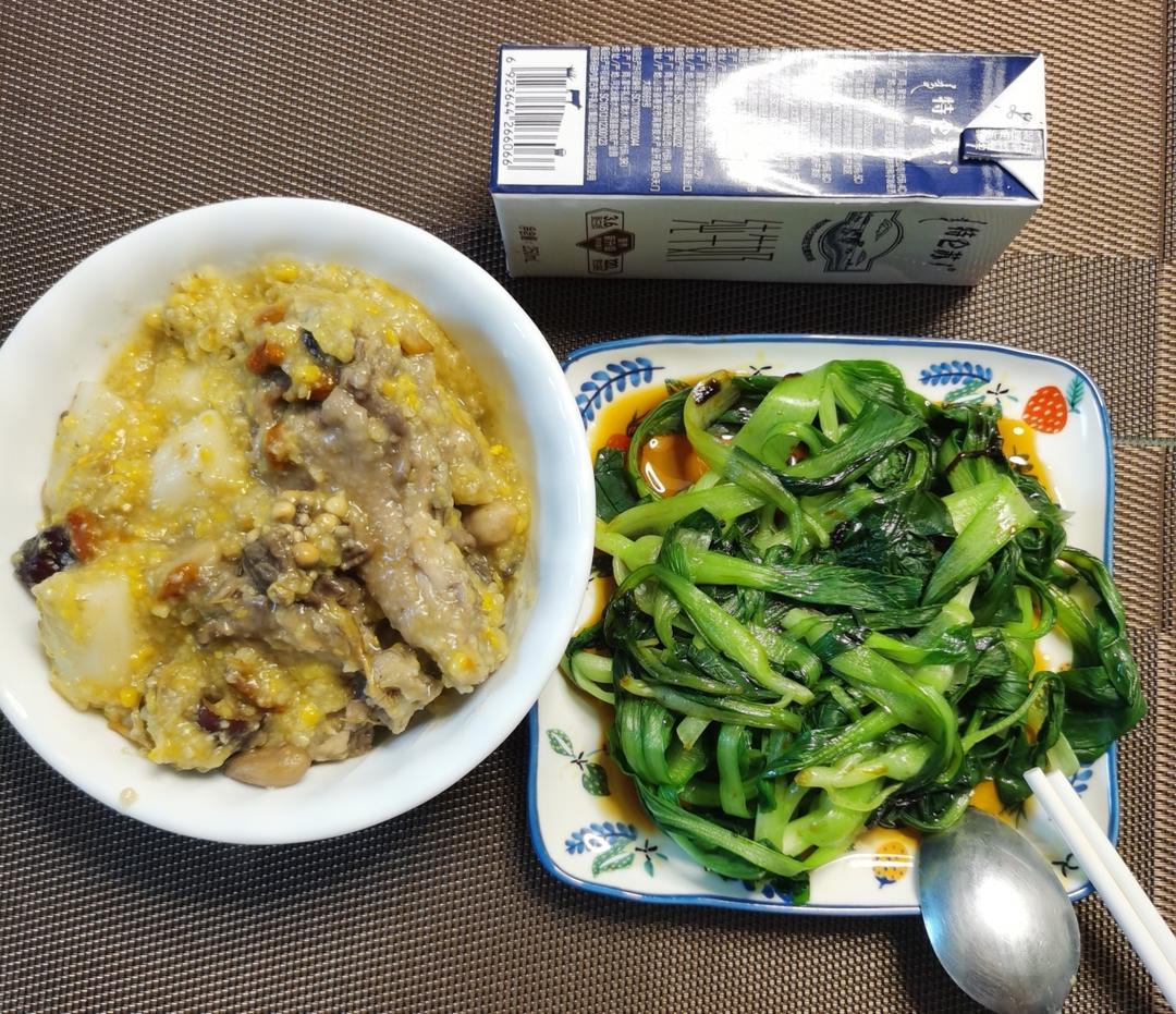 小米玉米渣淮山花生人参鸡肉粥,张大哥一人食,为喝牛奶...