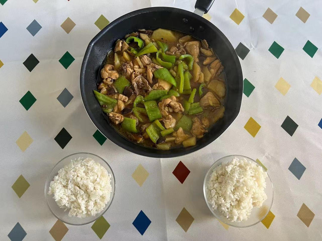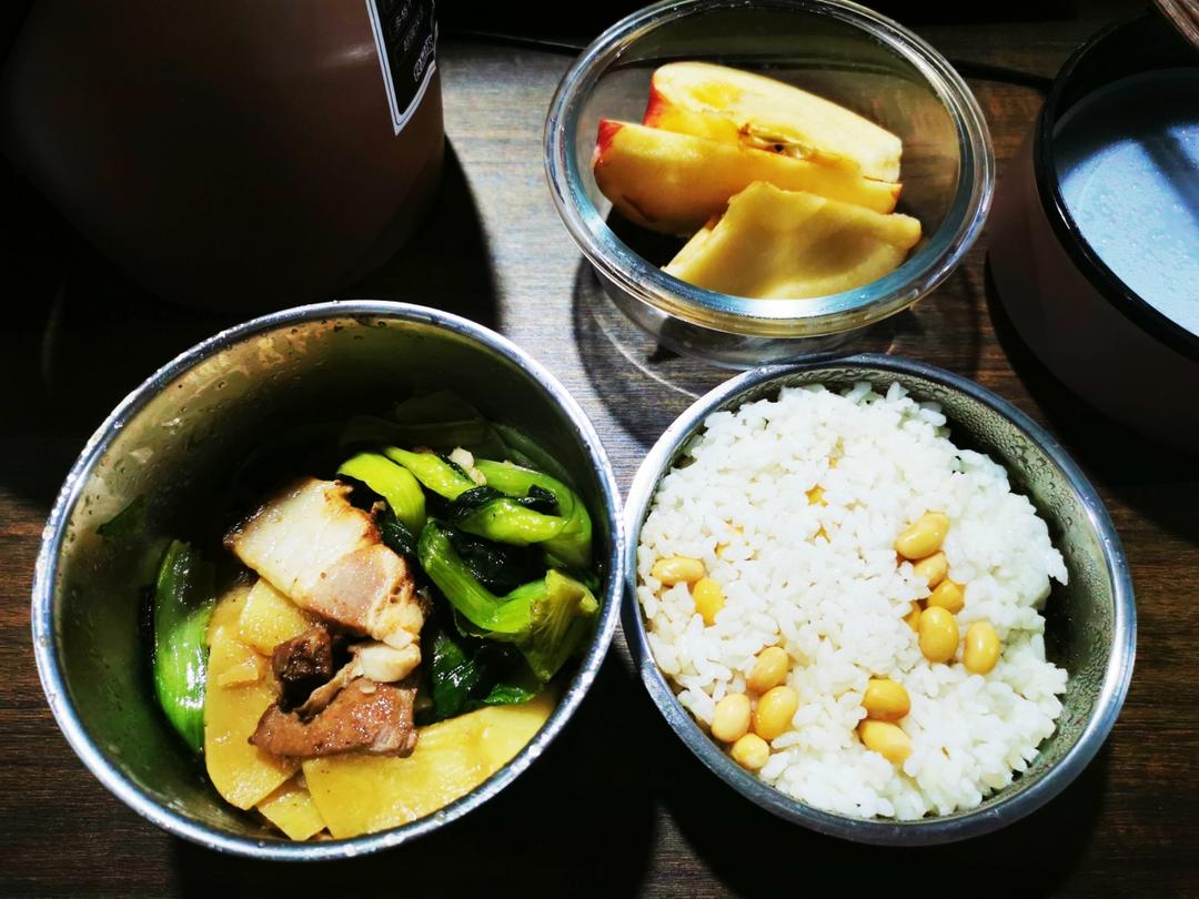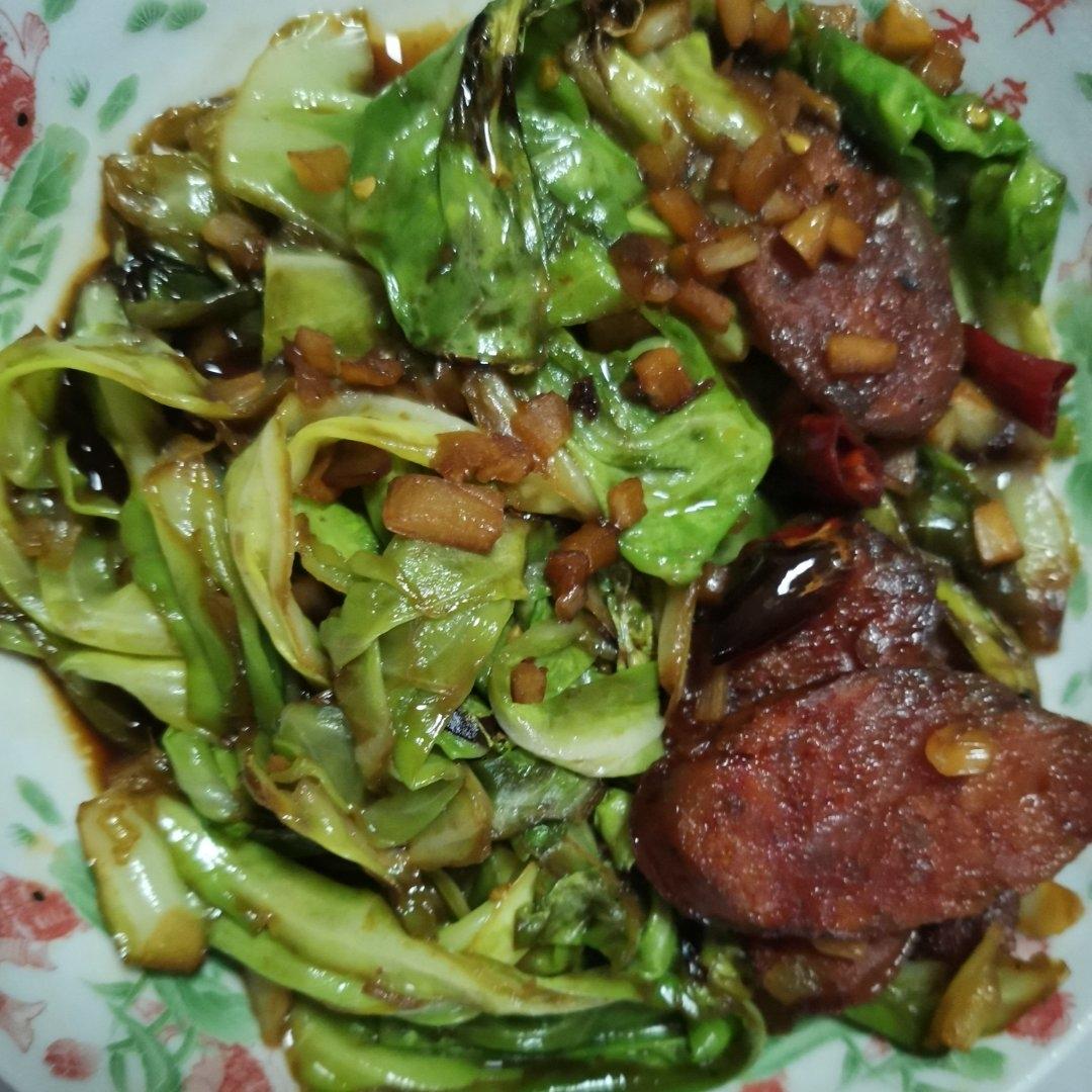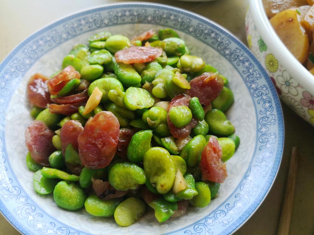 腊肠蚕豆米,五花肉土豆,白菜苔。俩人光盘