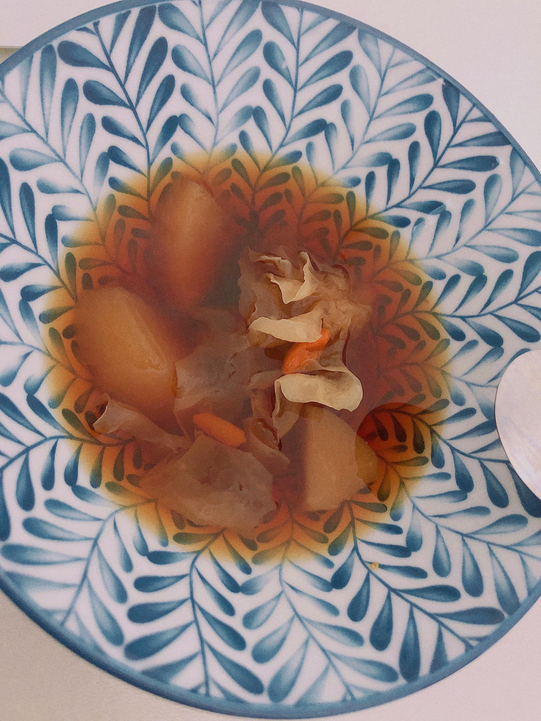 给自己熬了个冰糖雪梨银耳汤 放了枸杞和大枣 大枣熬烂在里面 汤汁甜甜的