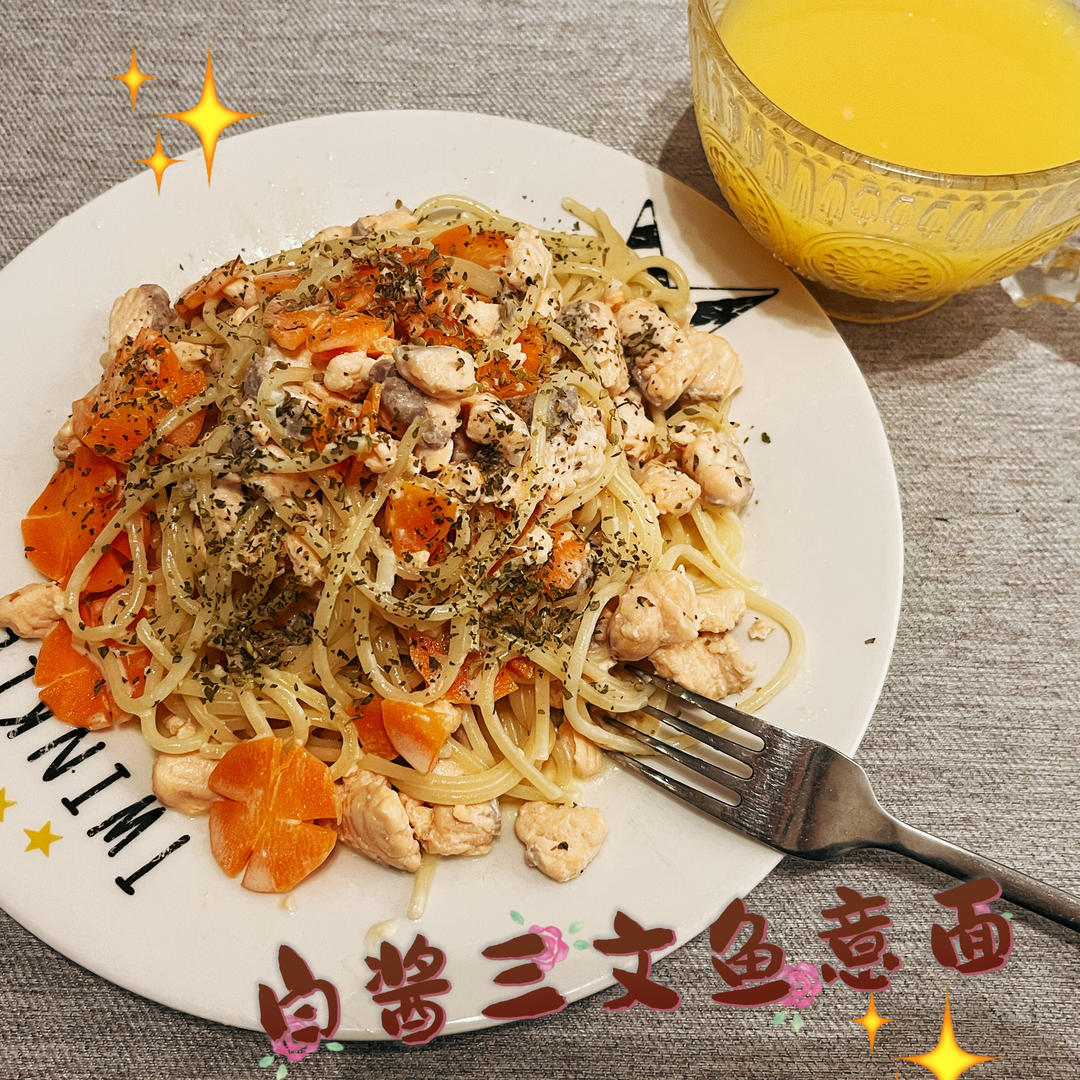 白酱三文鱼意面,虽然缺了点绿色。仔说好好吃!
