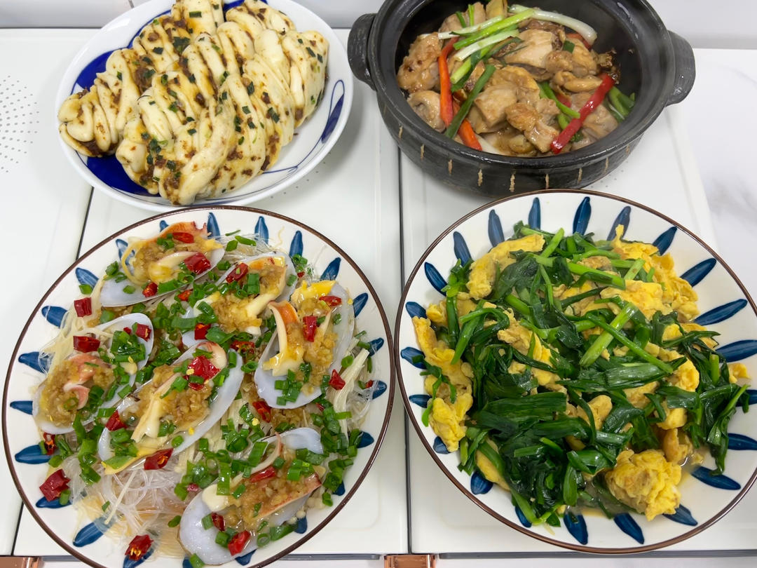 沙姜焗鸡、韭菜炒蛋、蒸蚌仔&花卷
