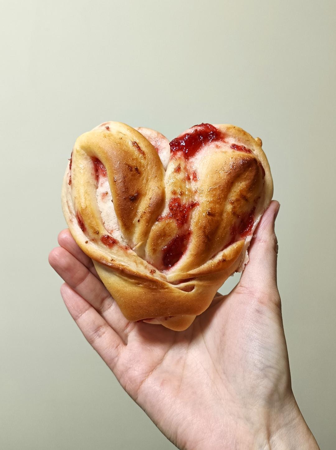 用简简的草莓果酱和even的万能甜面团做的爱心果酱面包还不错