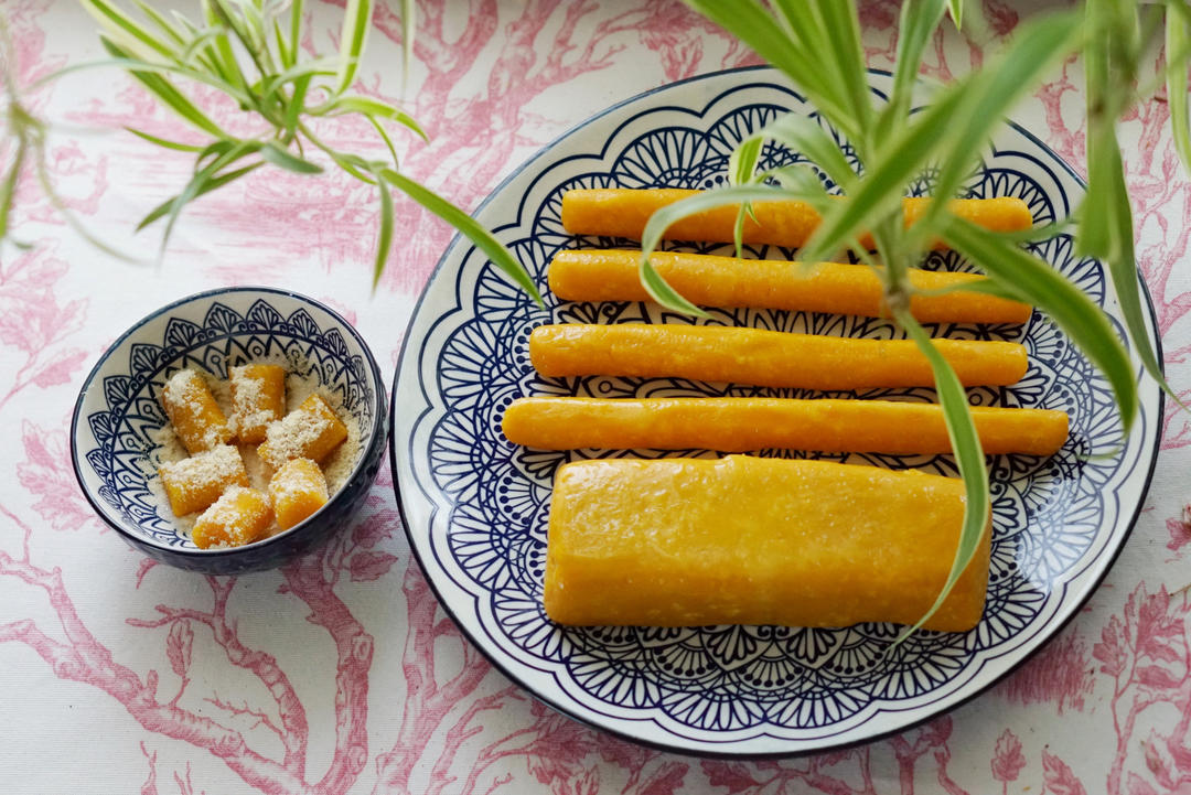 我的南瓜年糕来了,为了有点嚼劲我用了一半糯米粉一半粘米粉,还加了一勺木薯粉,出锅就被我吃掉一根,拌了黄豆粉和...