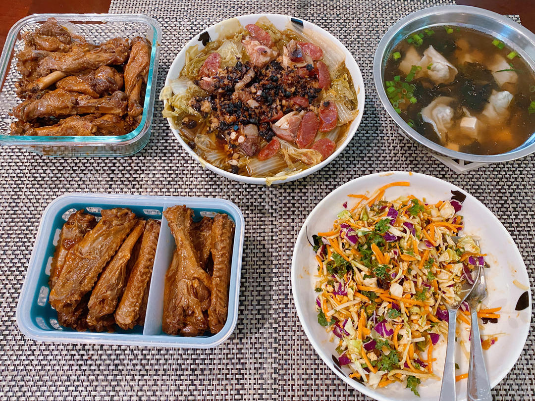 四季豆炒肉丝,盐焗鸡中翅,芝麻酱拌面+鸡蛋