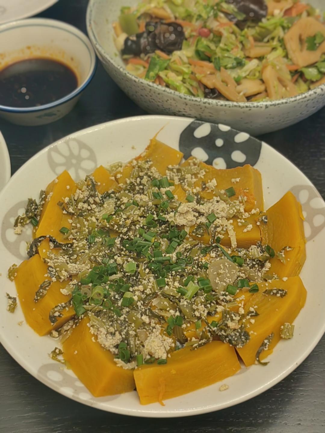 雪菜炒鱼籽铺在南瓜上,真的好好吃,有研究出一个新菜!现在的鲳鱼好多鱼籽。
