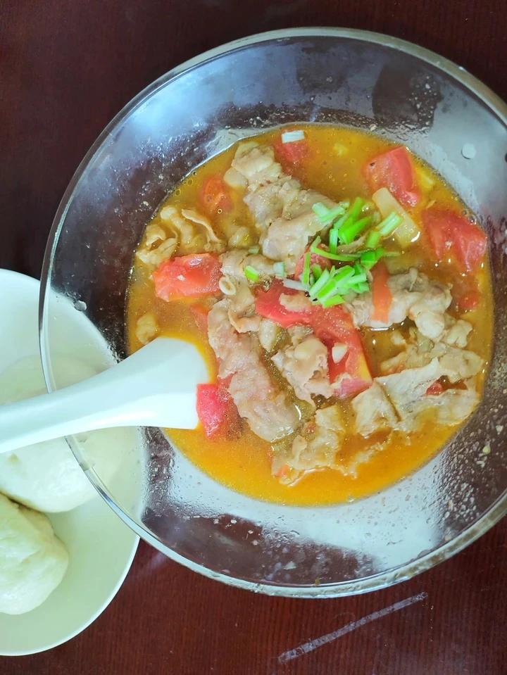 番茄肥牛+豆包。噜啦噜啦噜啦嘞~ 这汤煮面条也能好吃 。我中奖了,我包的时候包了个空的和...