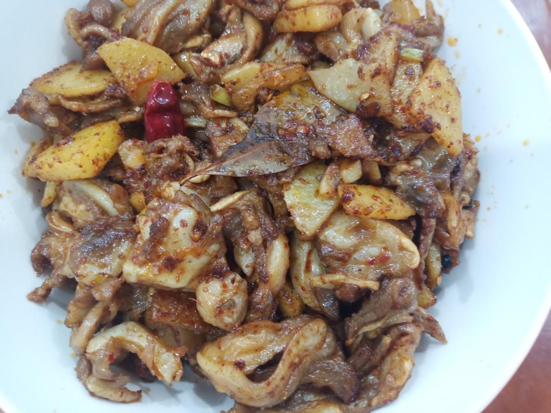 孜然土豆脆骨,土豆煎香,袋装脆骨焯水后用油炒干,加火锅底料,花椒,蒜末,干辣椒和土豆加几勺孜然,还有盐,出锅很香!#午餐...