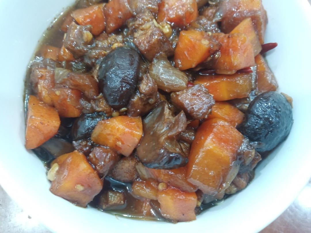 五花肉焯水,炒干加糖,加八角桂皮香叶,还有老抽,再加干香菇和胡萝卜,还有炸好的洋葱,加香菇水以及开水,小火煮20多分钟,...