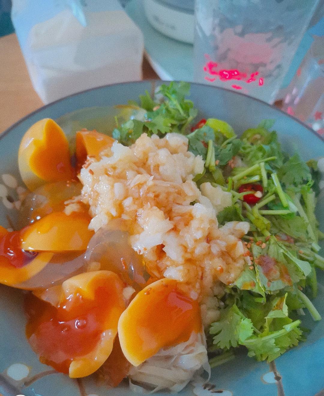 杂面油菜煮熟过凉水,香菜小米辣杭椒切碎,皮蛋切块,一头新蒜捣成蒜泥(因为是新蒜所以特别好捣),加入生抽陈醋...