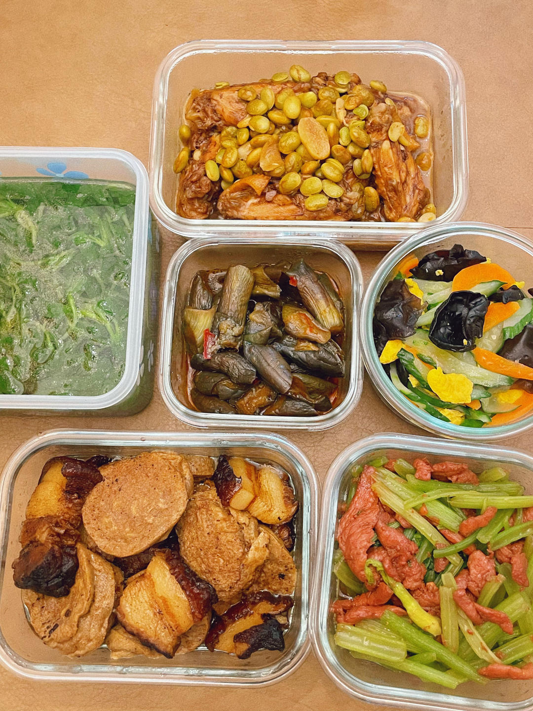 毛豆烧鸡翅,红烧扣肉素鸡,芹菜炒牛肉,烧茄子,黄瓜炒蛋,鸡毛菜汤
