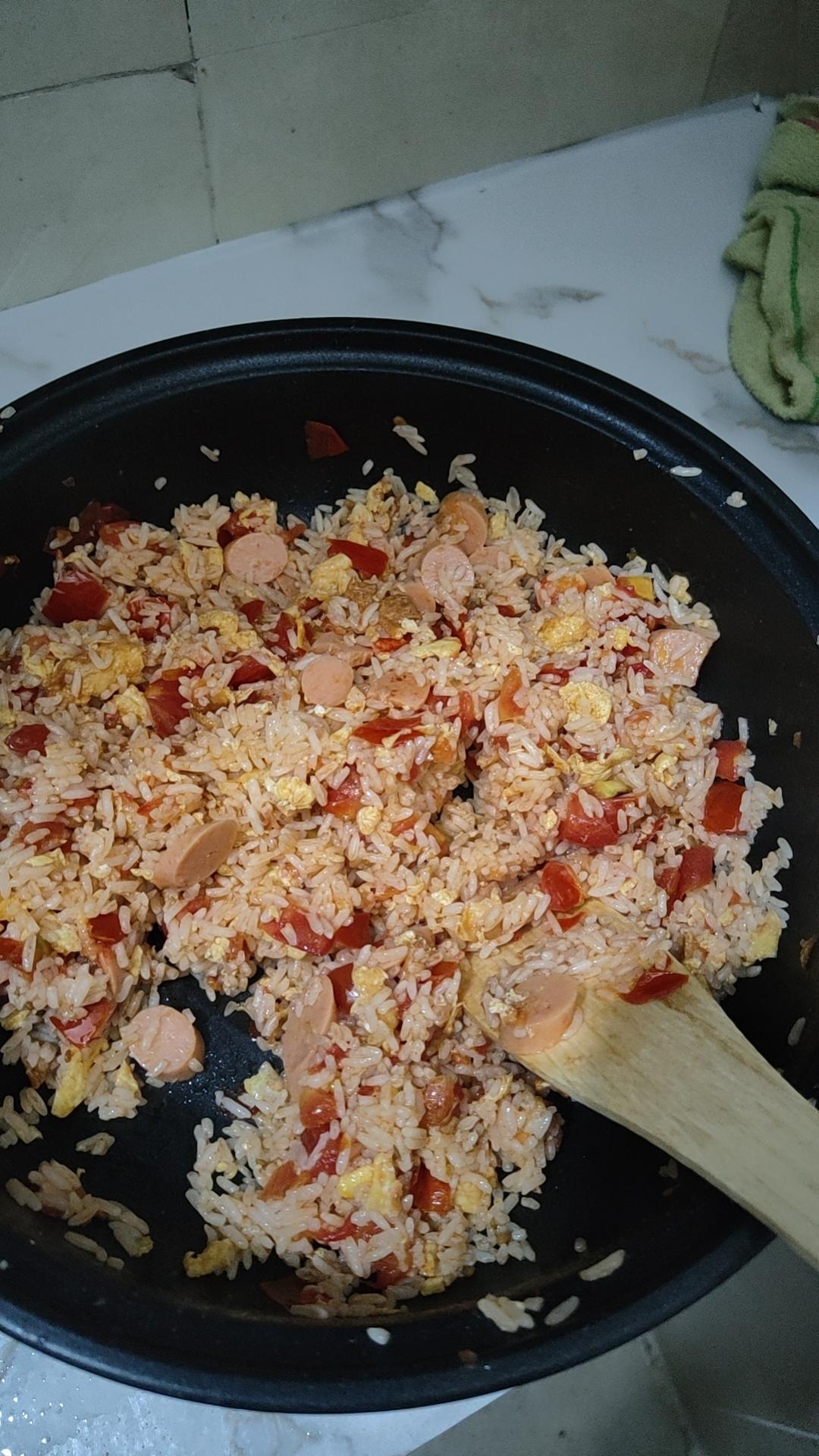 厨房新人炒的第一蹲番茄鸡蛋火腿饭,味道不错,成功芜湖
