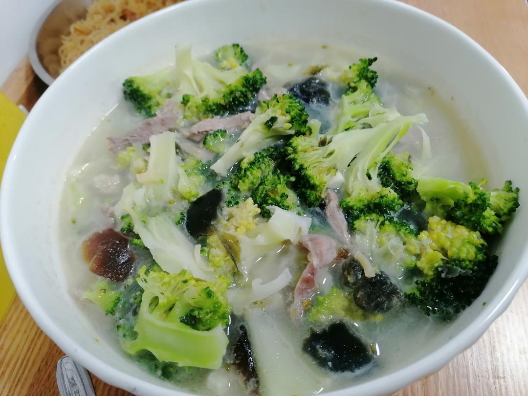 上汤西兰花,葱油脆肉鲩,土豆鸡肉,泡菜牛肉,炒米粉