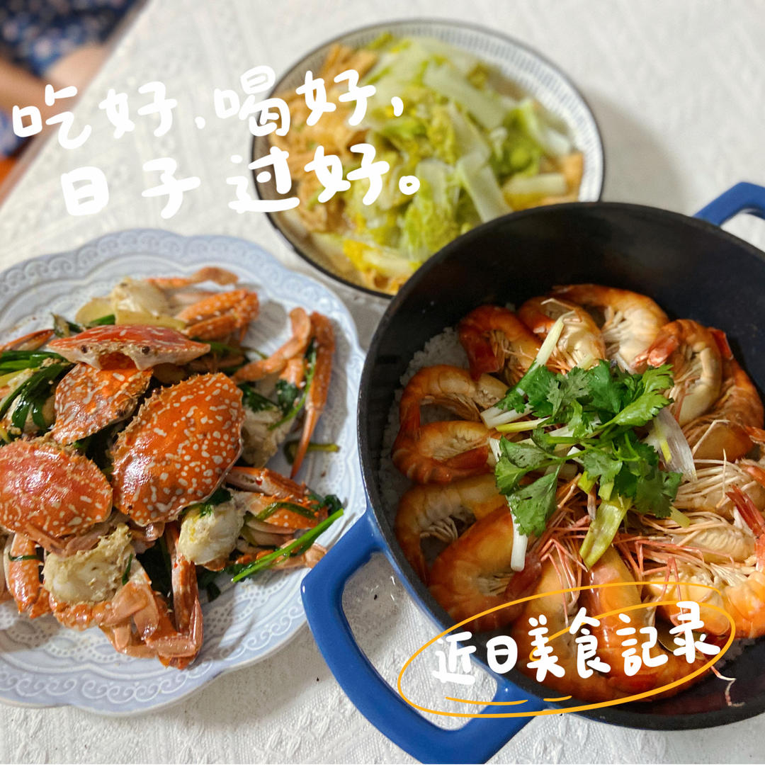 盐焗罗氏虾、姜葱炒花蟹、腐竹白菜