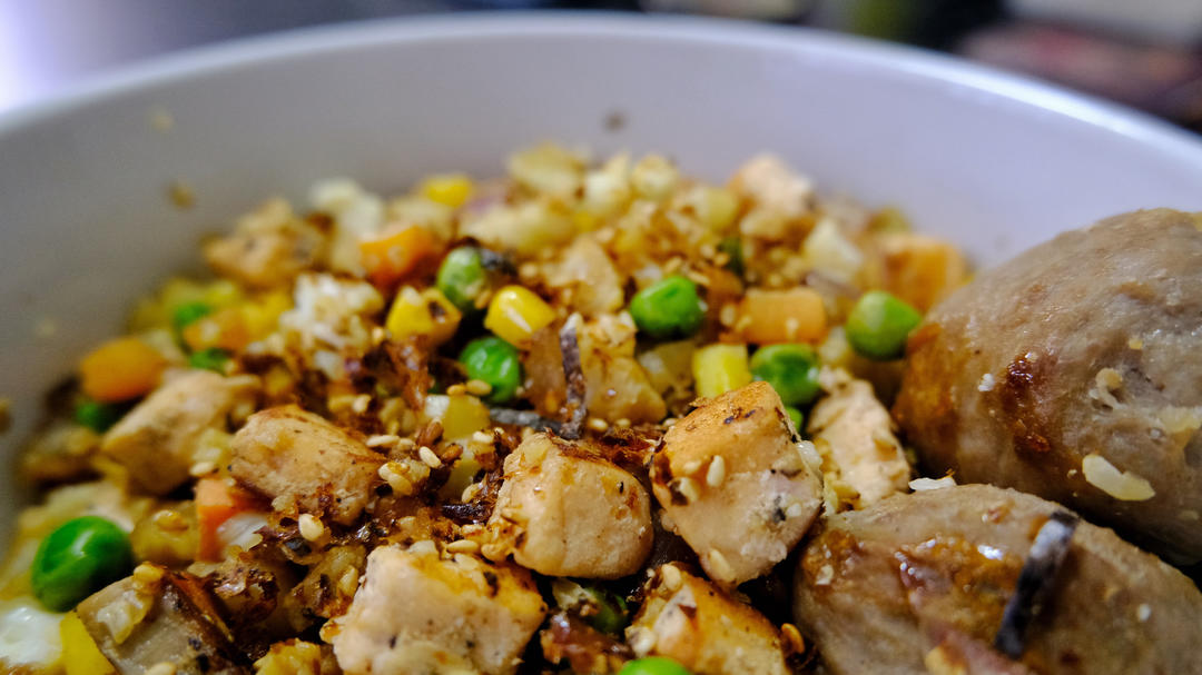 三文鱼炒菜花,调料是生抽,盐,鲣鱼粉,出锅后撒了点拌饭松。应该泡点蘑菇的,但今天上午有点忙,没仔细想也没来得及。