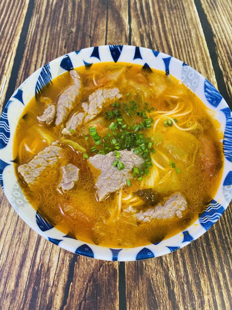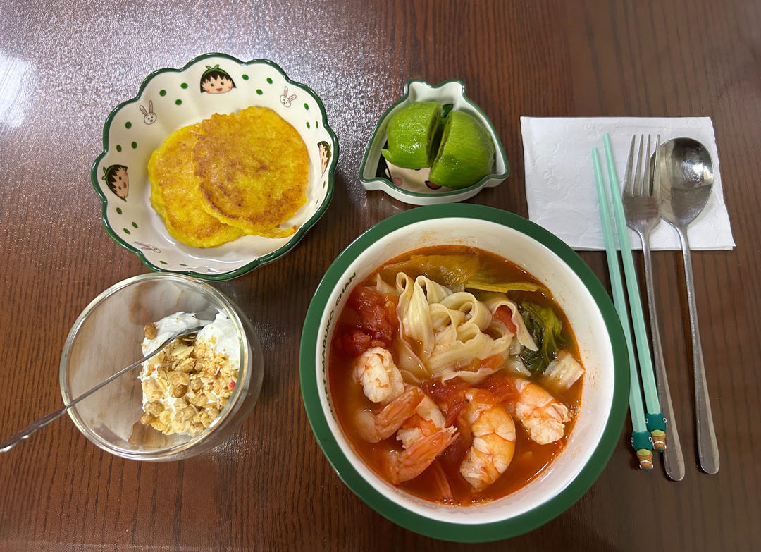 番茄虾仁蔬菜面🥬玉米浆包,酸奶麦片,猕猴桃🥝