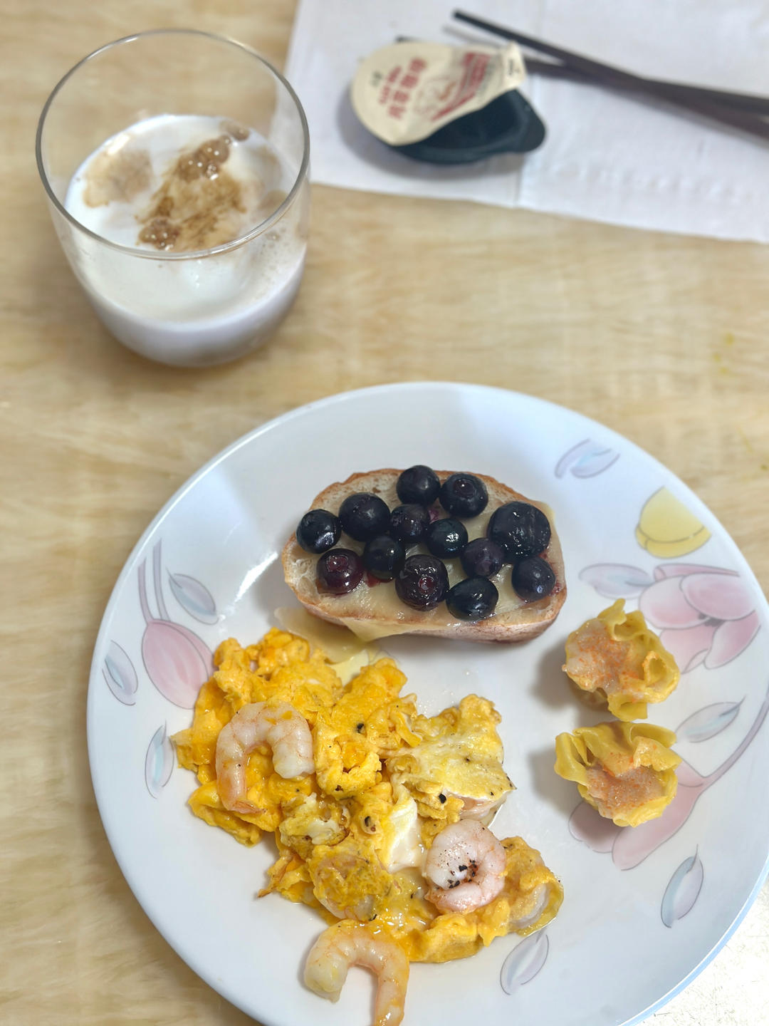 吃早餐咯~蓝莓芝士恰巴塔、鸡蛋炒虾、搭配牛奶咖啡…元气满满。