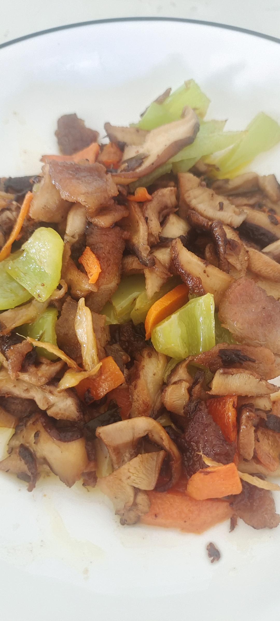 没有腌肉,就是五花肉,家里没有红椒,放的胡萝卜,还挺好吃,就是盐放多了哈哈哈