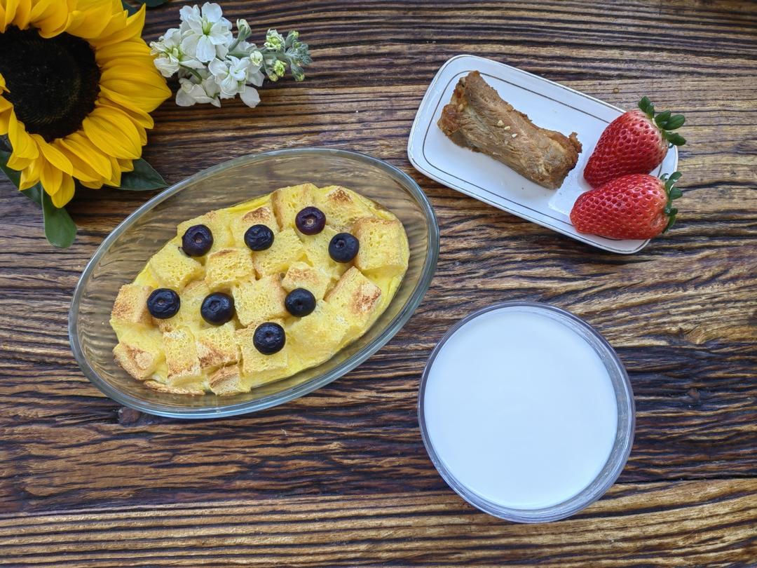牛奶🥛+蛋烤吐司🍞+蒜香排骨🍖+草莓🍓