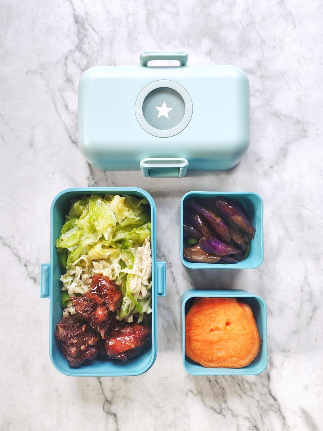 今日便当:清炒卷心菜+茭白肉丝+红烧鸭腿+青椒茄子+蒸红薯~~
